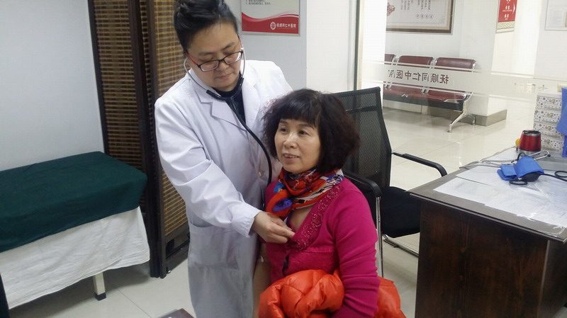 醫(yī)生拿著聽診器在為員工做內科檢查