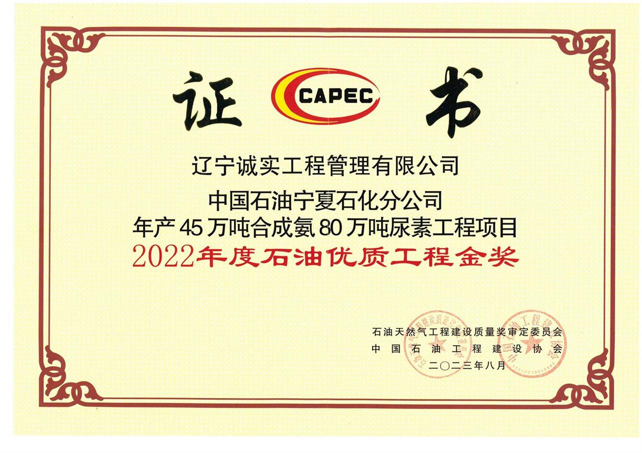 祝賀遼寧誠實(shí)參建的“中國石油寧夏石化分公司年產(chǎn)45萬噸合成氨80萬噸尿素工程項(xiàng)目”榮獲2022年度石油優(yōu)質(zhì)工程金獎(jiǎng)!這是一份遲到的榮譽(yù),但是卻未曾缺席。