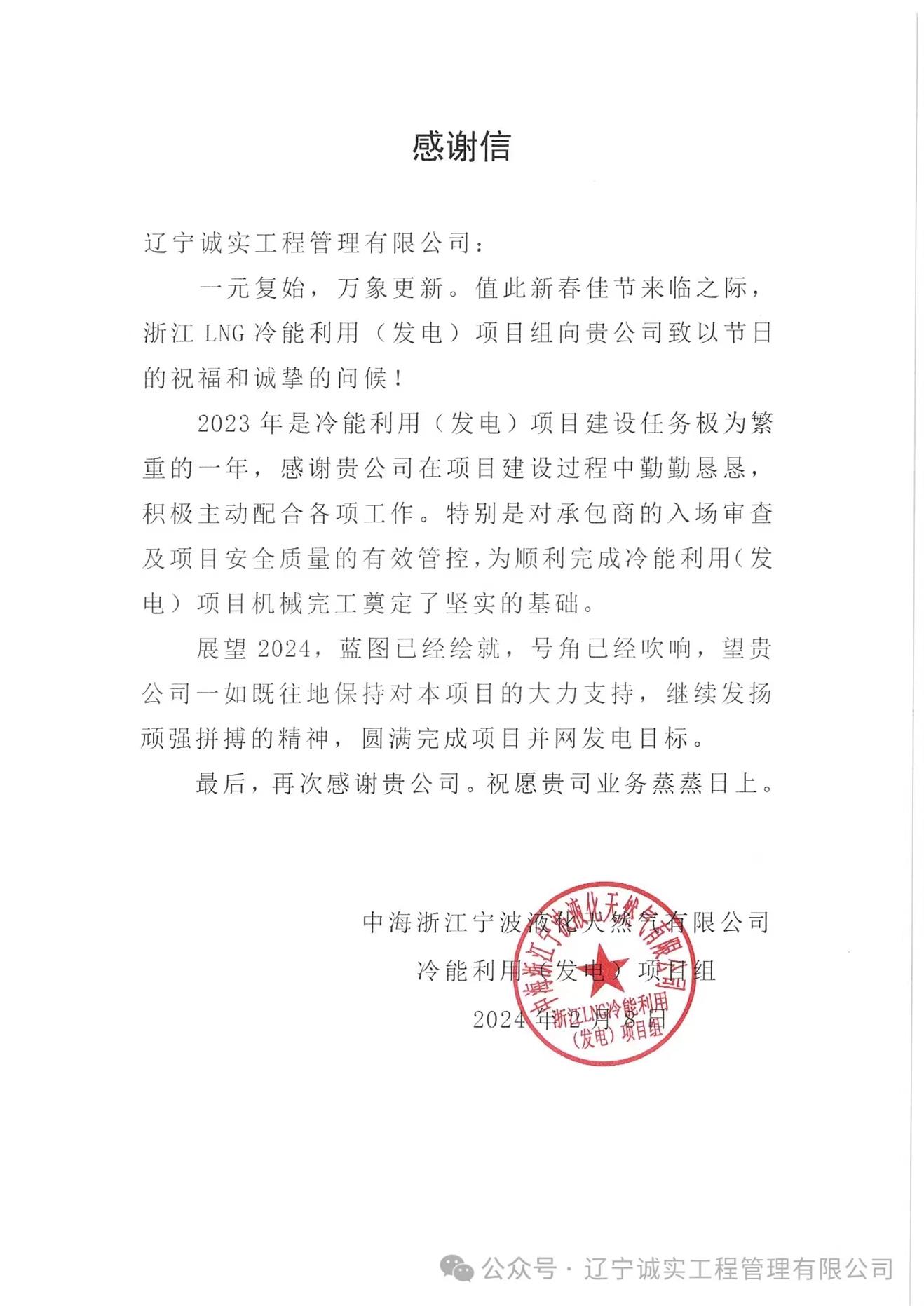 浙江LNG冷能利用(發(fā)電)項目組向公司發(fā)來了感謝信,信中肯定了公司項目部人員在2023年的努力,特別是對于承包商入場審查及項目安全質(zhì)量的有效管控,為項目機(jī)械完工奠定了堅實(shí)的基礎(chǔ)。該項目是積極響應(yīng)國家及浙江省“十四五”規(guī)劃的節(jié)能減排政策,落實(shí)“綠色低碳”發(fā)展戰(zhàn)略的示范項目,項目投產(chǎn)后,預(yù)計年凈發(fā)電量約為2408萬度,節(jié)省標(biāo)準(zhǔn)煤超3000tce,年減少CO₂排放可達(dá)18000多噸。展望2024年,項目部在黃思敏總監(jiān)的帶領(lǐng)下,將認(rèn)真執(zhí)行監(jiān)理職責(zé),積極推進(jìn)項目建設(shè),爭取項目早日建成投產(chǎn)。